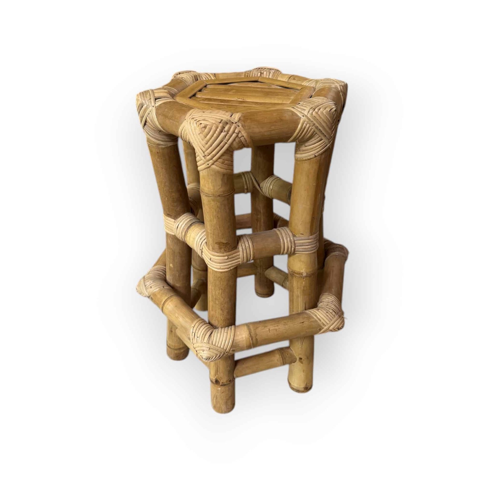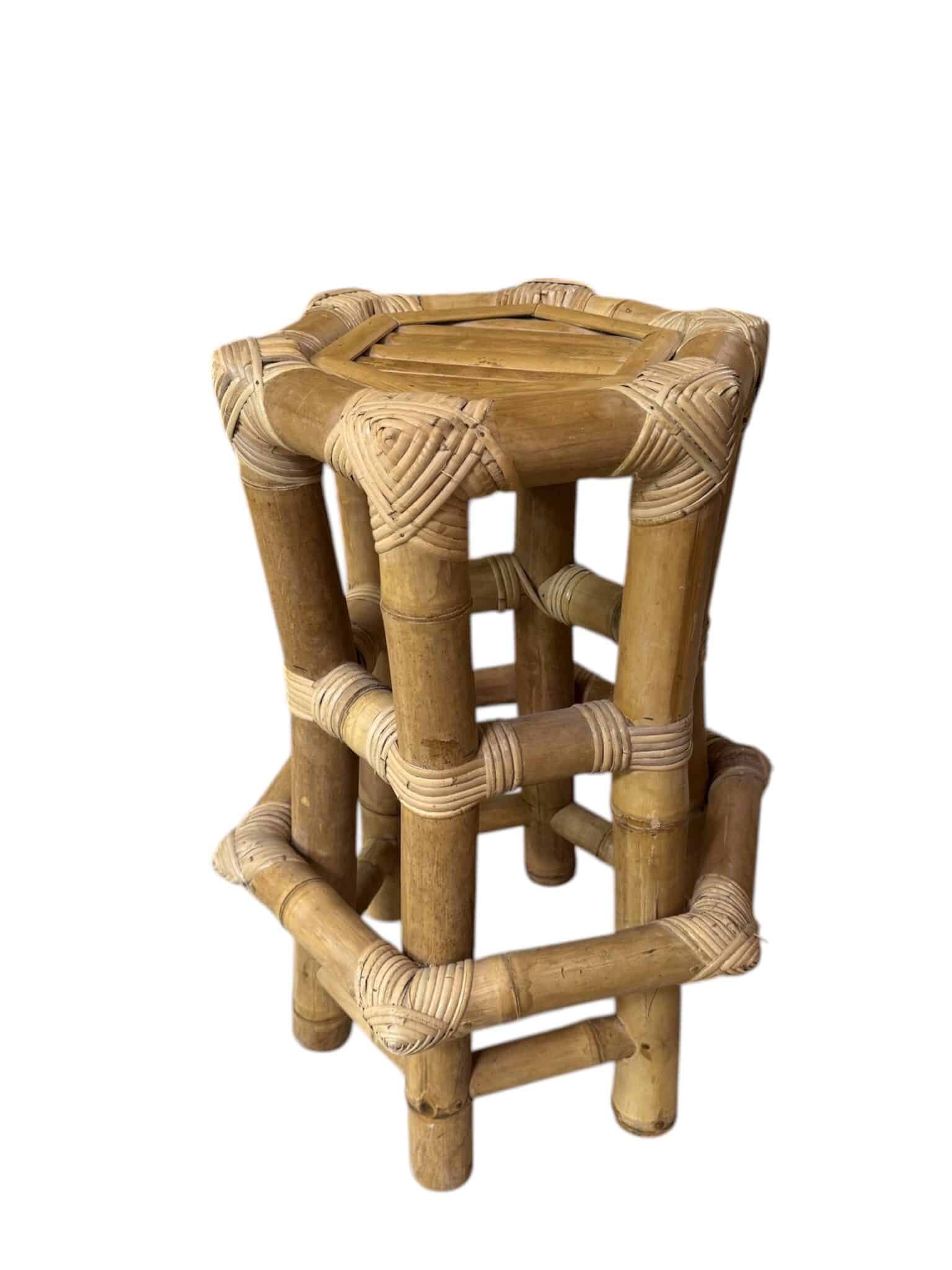 Fabriqué à partir de bambou épais, chaque élément est soigneusement assemblé à la main et renforcé par des liens en rotin clair. L’assise plate offre une surface stable et confortable, tandis que la structure inférieure, travaillée avec des croisillons en bambou, assure une excellente stabilité tout en ajoutant du caractère à l’ensemble.